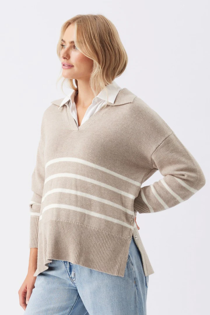 The Lori Nursing Knit by Ripe Maternity features a slouchy, relaxed fit constructed from a warm, yet breathable blend of polyester, acrylic, nylon, and wool. This softly textured knit sweater with its modern polo collar leads to a deep v-neckline and split side seams with snap closures for easy nursing access. Whether you're lounging at home, running errands, meeting friends, or looking for that perfect breastfeeding jumper for your baby to snuggle into, this will be your go-to knit.