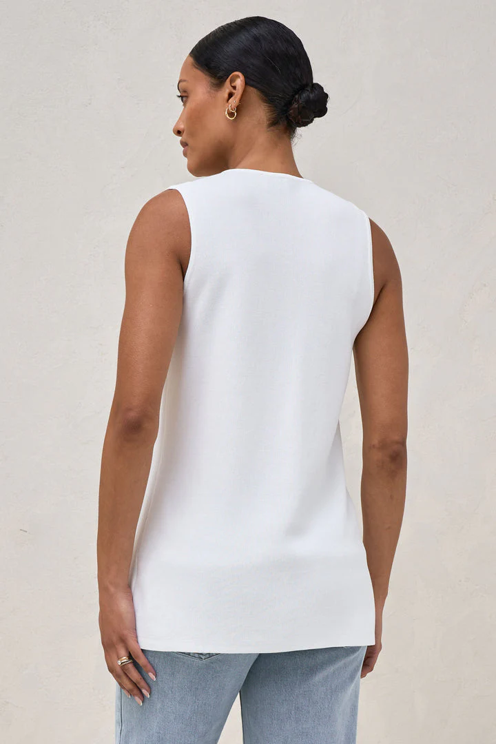 A vest tank featuring buttons for easy nursing access. It's crafted from a signature light-weight Milano blend and effortlessly transitions from work to weekend.