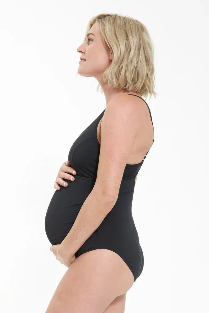 The Ultimate One Piece is made from chlorine resistant polyester for regular pool use. With adjustable straps and optional cross over at back, this one piece will take you through all the stages of pregnancy. Also features gathers at the tummy and removable bra cups.